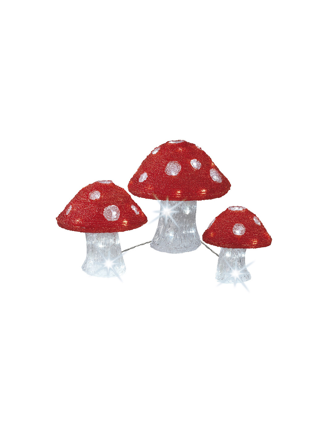 Pack de 3 figurines champignon acrylique exterieur distance entre champignons 1m. cable d'alimentation 5m. dimensions (hauteur):25cm - 32 leds, 20cm - 24 leds, 18cm - 16 leds. lumiere froide.220-240v