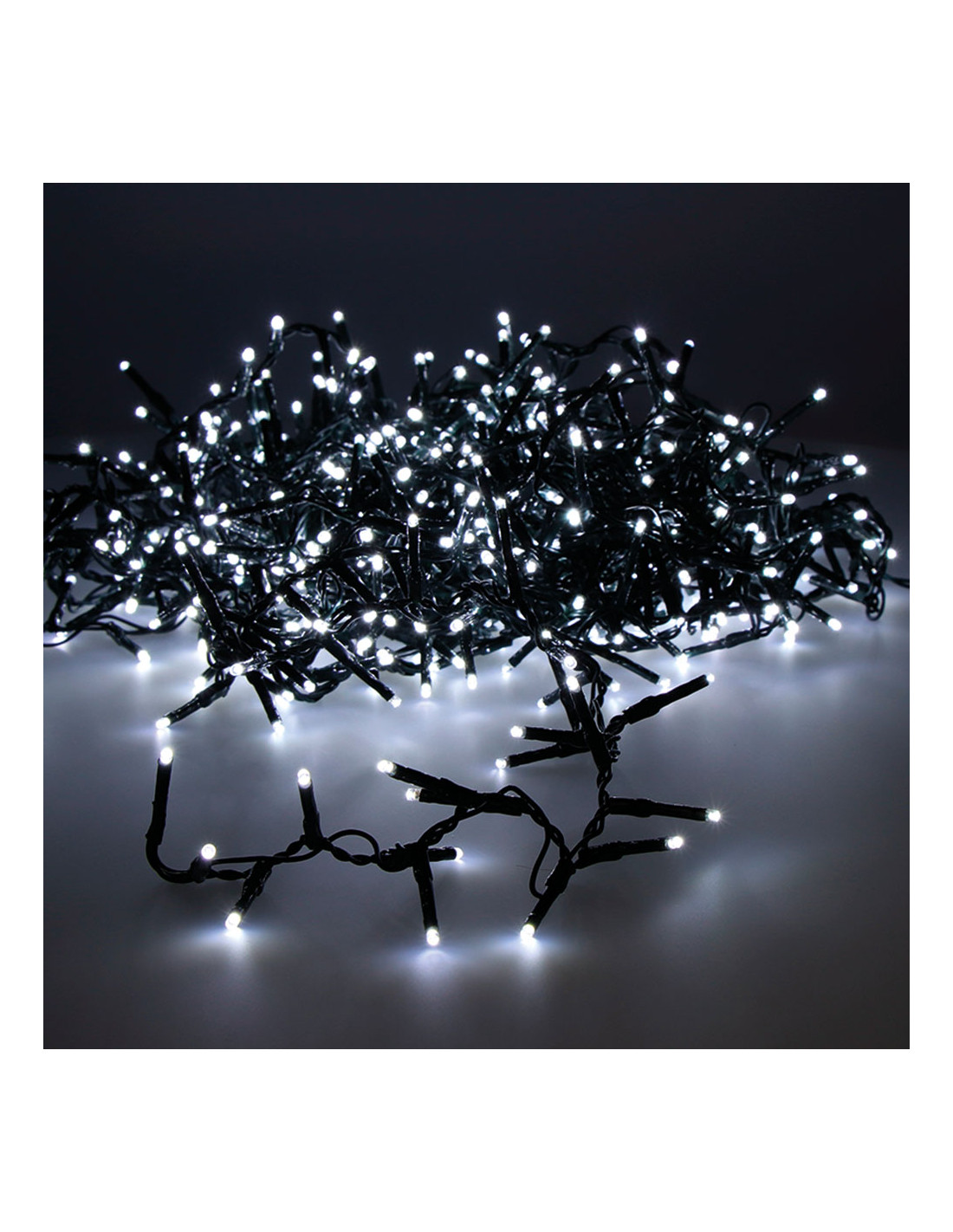 Guirlande led compacte clignotante exterieur couleur blanc froid cable vert, temporisateur 8 heures, 8 fonctions, ip44 16m 500l cable d'alimentation 5m. distance entre la première ampoule et la dernière 11m. longueur totale : 16m.