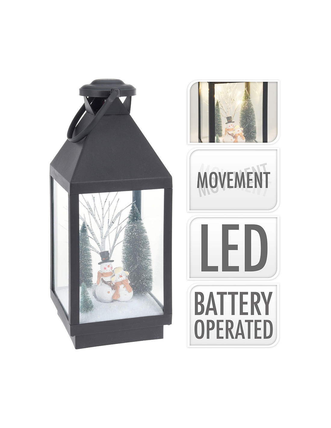 Lanterne avec scene de noel lumiere en mouvement, led lumiere chaude, 18,8x48cm (largeur/hauteur) avec scene de bonhomme de neige. 3xaa non incluses et temporisateur.