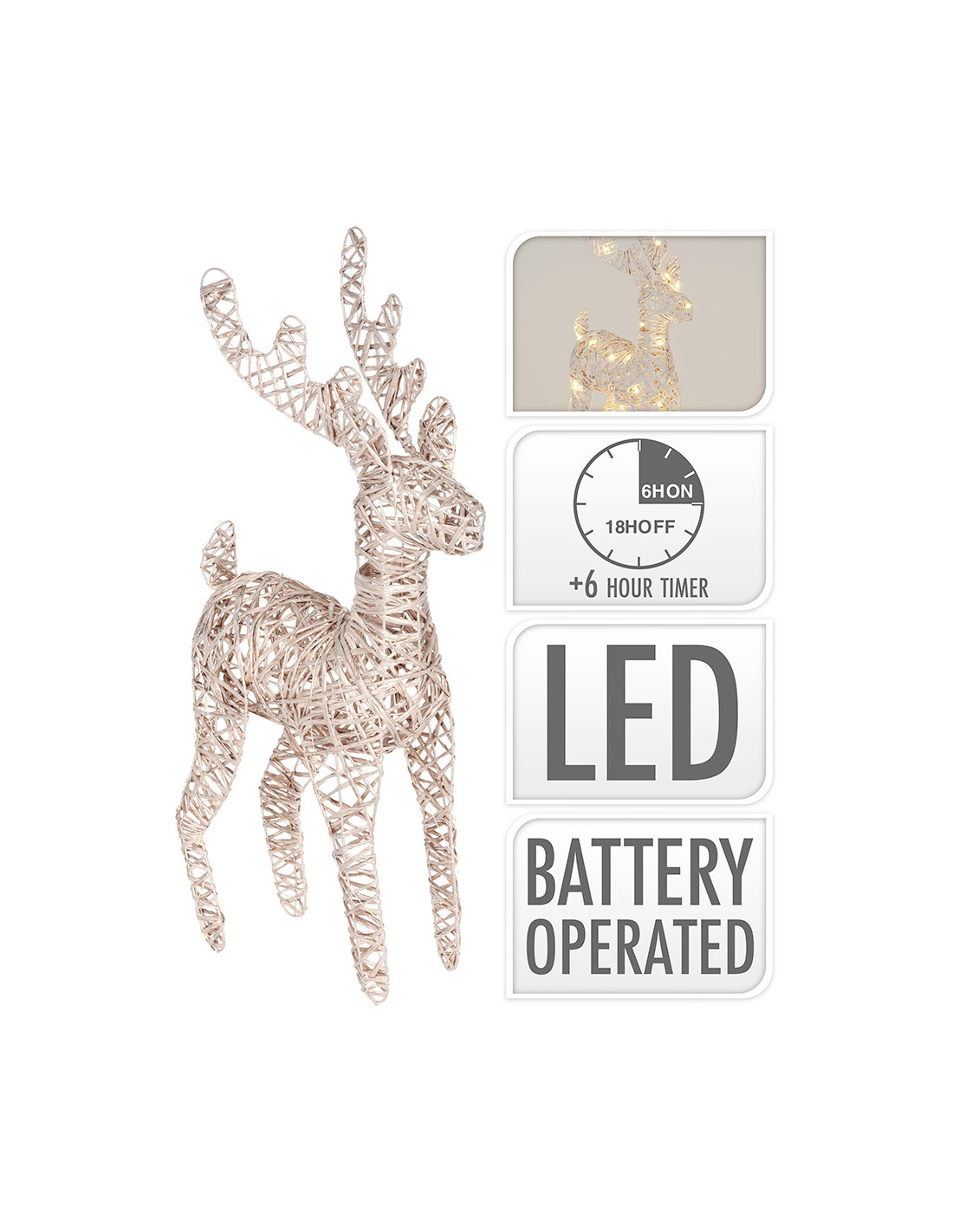 Renne doré avec 50 leds lumiere chaude 11x30x45cm (largeur/profondeur/hauteur) ip20 interieur 3xaa non incluses. programmateur 6h