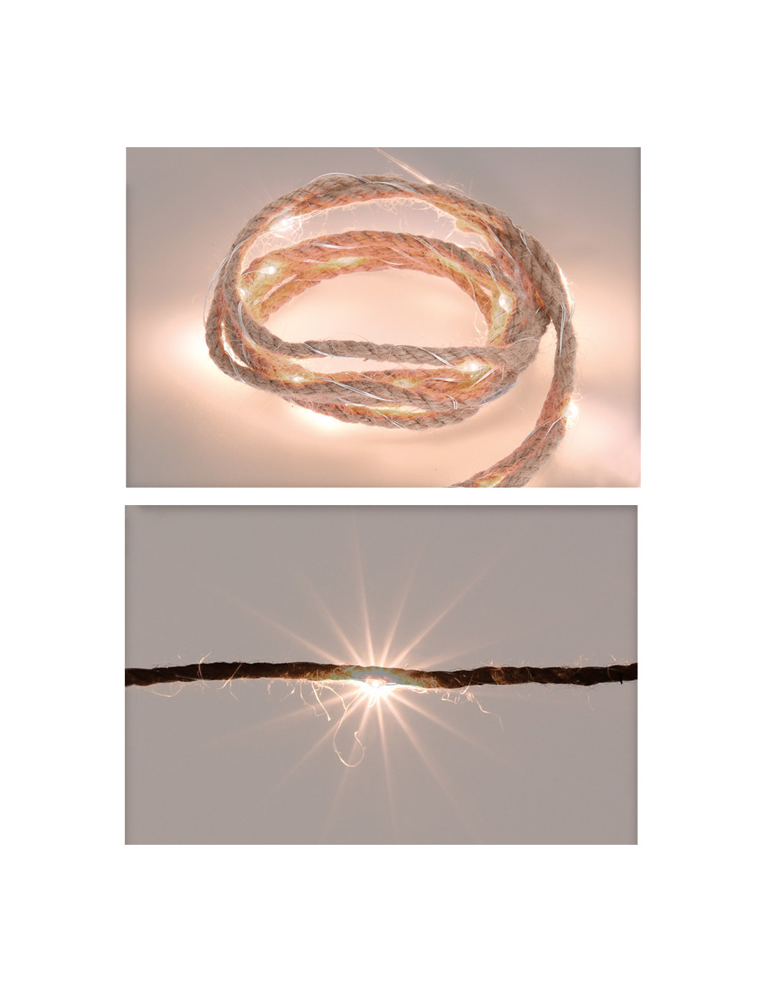 Guirlande fixe a piles 10 leds corde de jute lumière blanche chaude 1m piles 2xcr2032 (incluses) ip20 cable marron 10cm entre ampoules led ø5mm cable d'alimentation 0,10cm. distance entre la première ampoule et la dernière 1m. longueur totale : 1,10m.