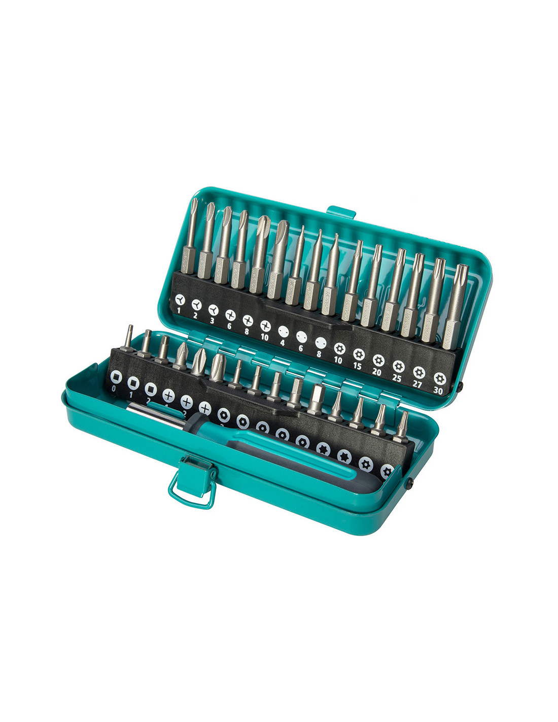 Boite de pointes de sécurité combinées 31 pièces dans boite metallique. pointes 25mm: femelle carrée interieure, philips, hexagone interieur avec trou, torx avec trou, pointes 50mm: tri-aile, torq, spanner, torx avec trou tournevis manuel wolfcraft.