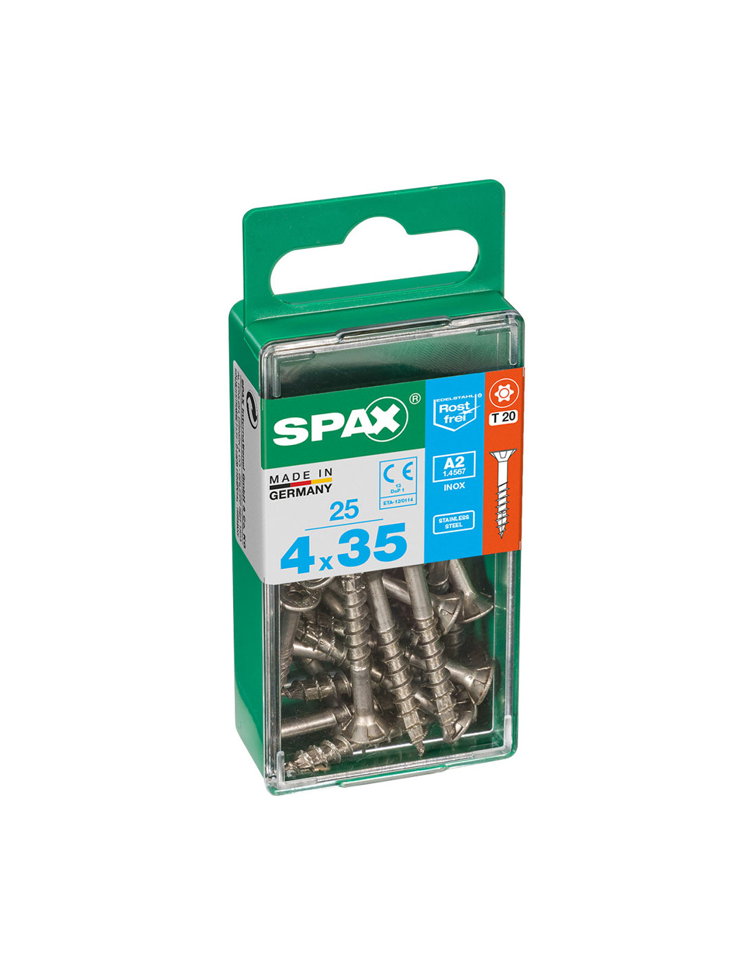 Boîte 25 unités. vis a bois spax cab. plat inox a2 4.0x35mm spax. vis en acier inoxydable, 4 x 35 mm, 25 pièces, filetage partiel, tête plate, t-star plus t20, 4cut, acier inoxydable a2 - 4197000400351