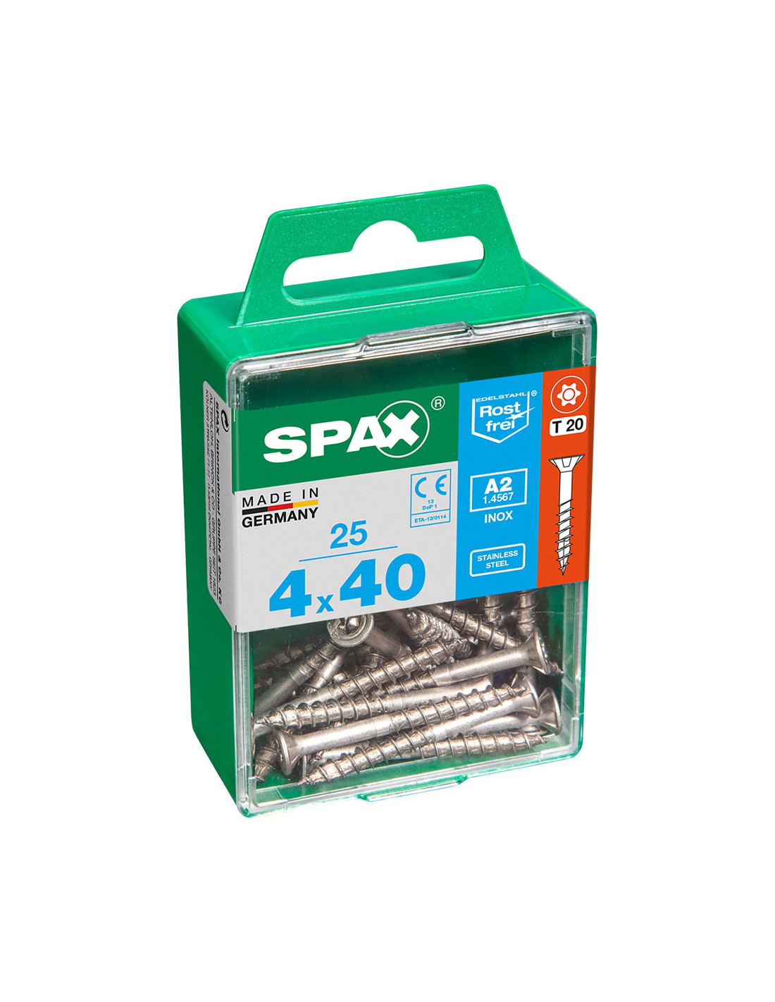 Boîte 25 unités. vis a bois spax cab. plat inox a2 4.0x40mm spax. vis en acier inoxydable, 4 x 40 mm, 25pcs, filetage partiel, tete plate, t-star plus t20, 4cut, acier inoxydable a2 - 4197000400402