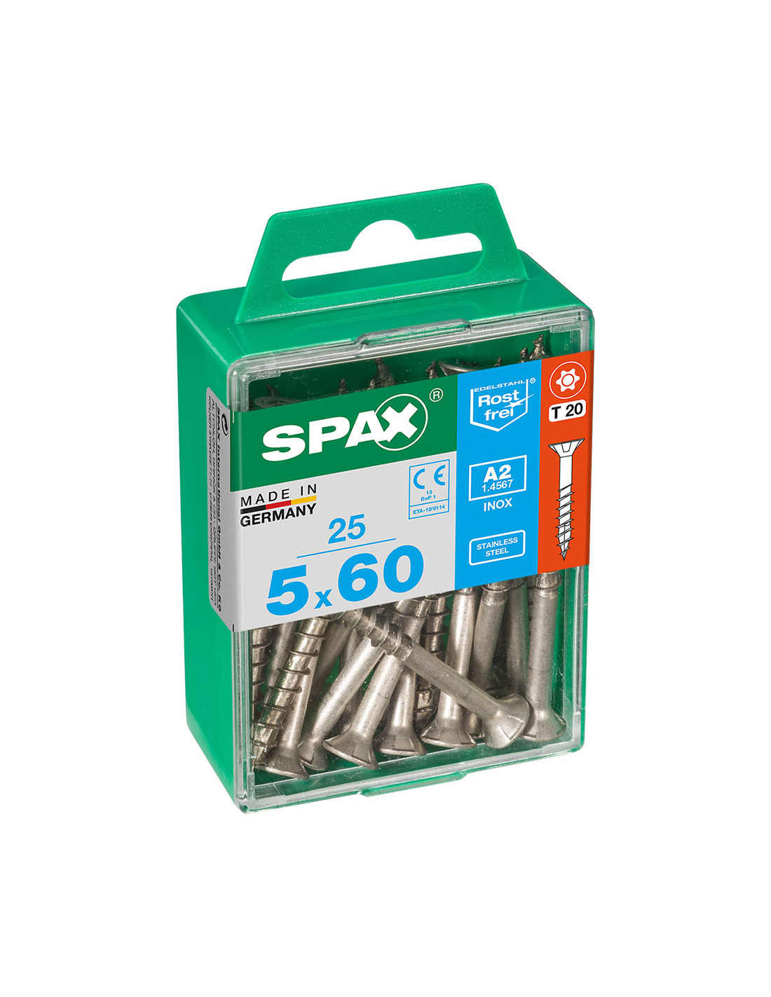 Boîte 25 unités. vis a bois spax cab. plat inox a2 5.0x60mm spax. vis en acier inoxydable, 5 x 60 mm, 25pcs, filetage partiel, tete plate, t-star plus t20, 4cut, acier inoxydable a2 - 4197000500602