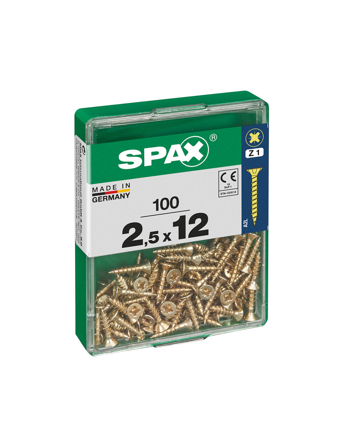 Boîte 100 unités. vis a bois spax cab. plat yellox 2.5x12mm spax. vis universelle, 2.5 x 12 mm, 100 pcs, filetage complet, tete plate, fente croisee z1, pointe s, yellox - 4081020250122