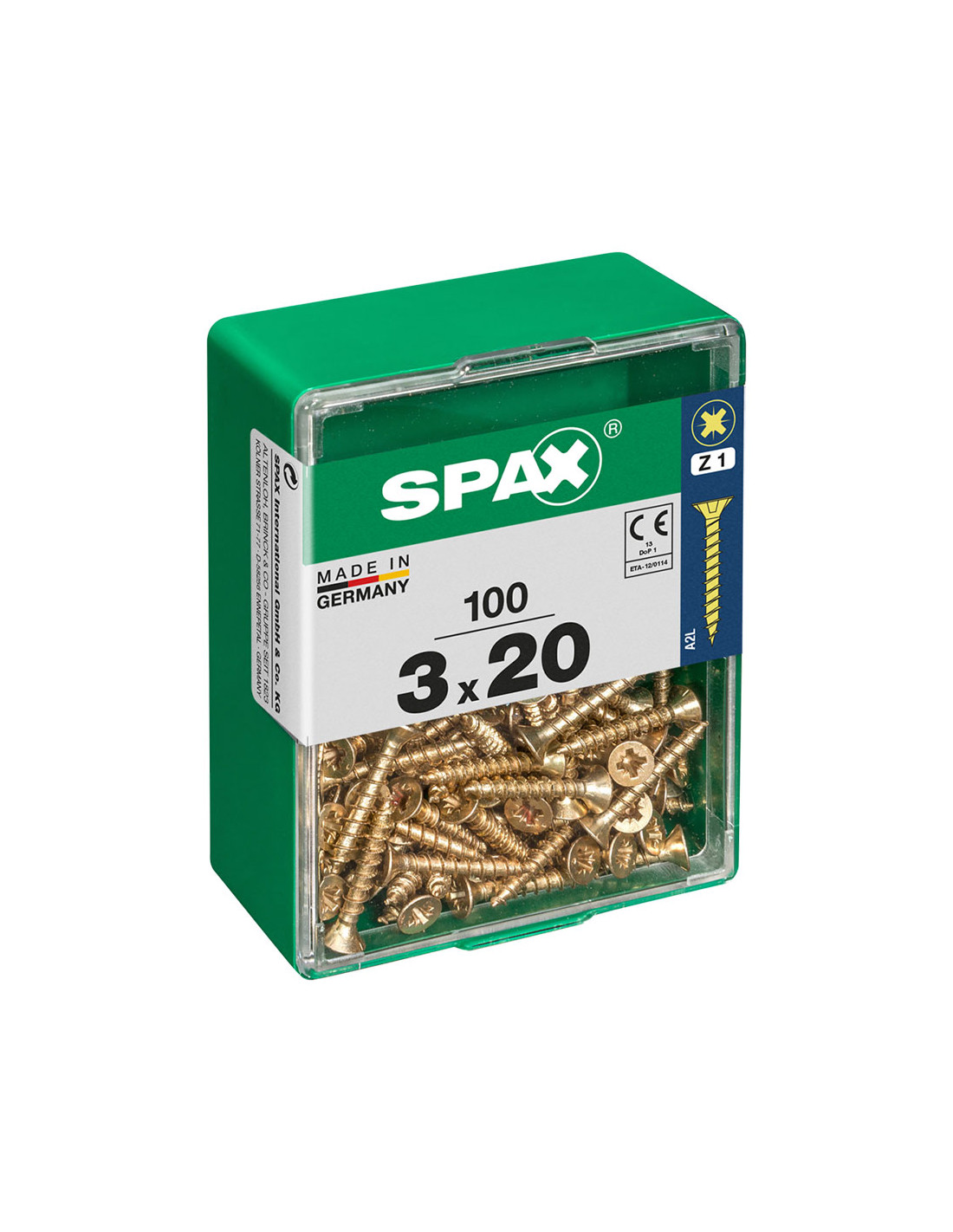Boîte 100 unités. vis a bois spax cab. plat yellox 3.0x20mm spax. vis universelle, 3 x 20 mm, 100 pcs, filetage complet, tete plate, fente croisee z1, pointe s, jaune - 4081020300202