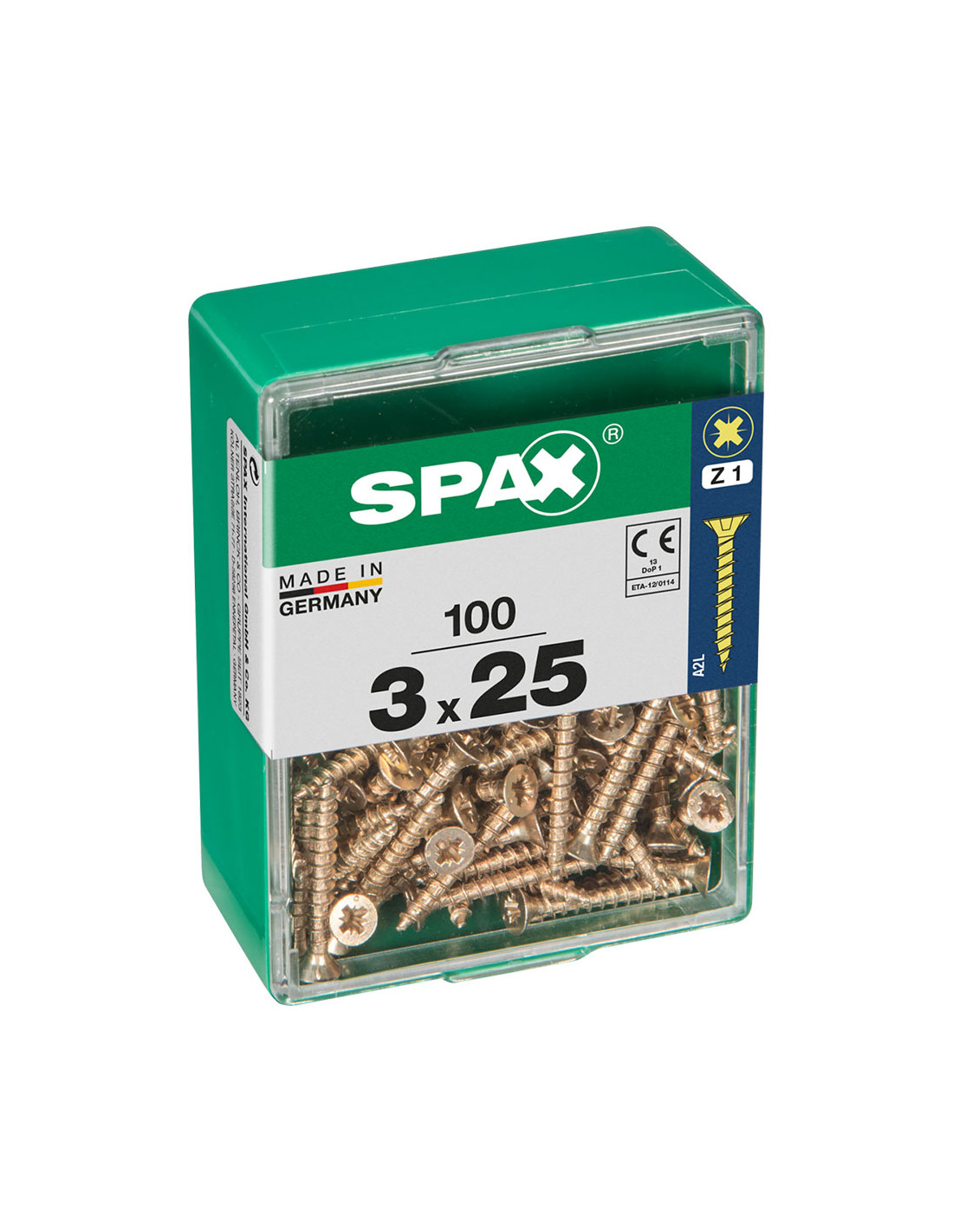 Boîte 100 unités. vis a bois spax cab. plat yellox 3.0x25mm spax. vis universelle, 3 x 25 mm, 100 pcs, filetage complet, tete plate, fente croisee z1, pointe s, jaune - 4081020300252