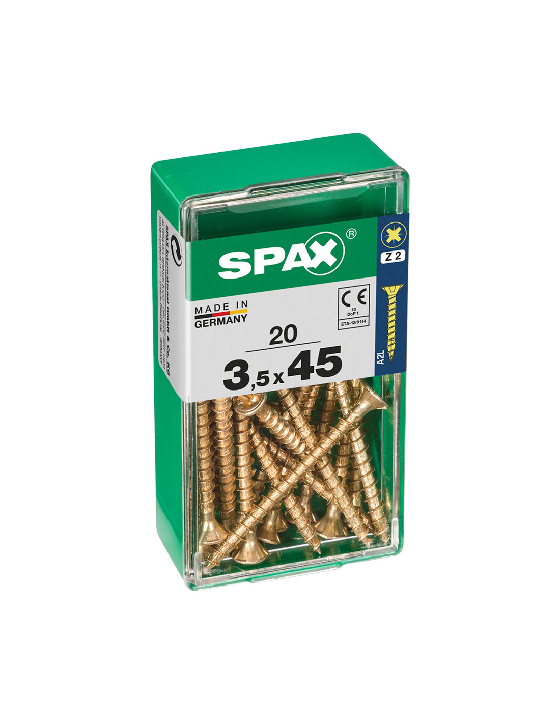 Boîte 20 unités. vis a bois spax cab. plat yellox 3.5x45mm spax. vis universelle, 3,5 x 45 mm, 20 pièces, filetage complet, tête plate, fente croisée z2, 4cut, yellox - 4081020350451