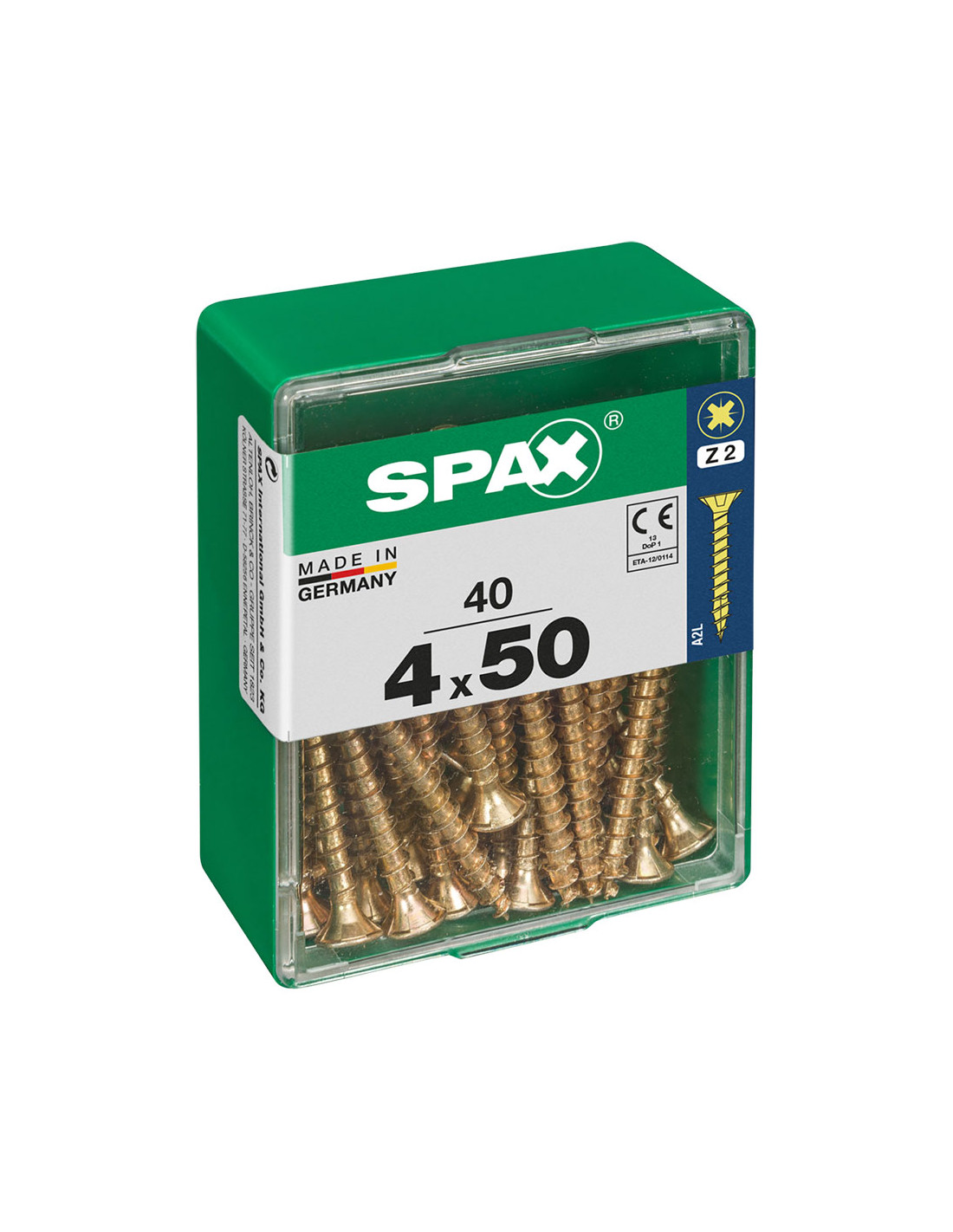 Boîte 40 unités. vis a bois spax cab. plat yellox 4.0x50mm spax. vis universelle, 4 x 50 mm, 40 pcs, filetage complet, tete plate, fente croisee z2, 4cut, yellox - 4081020400502