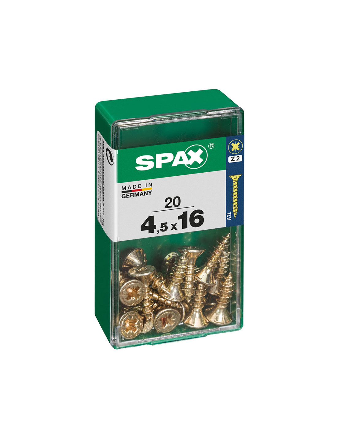 Boîte 20 unités. vis a bois spax cab. plat yellox 4.5x16mm spax. vis universelle, 4.5 x 16 mm, 20 pcs, filetage complet, tete plate, fente croisee z2, 4cut, yellox - 4081020450161