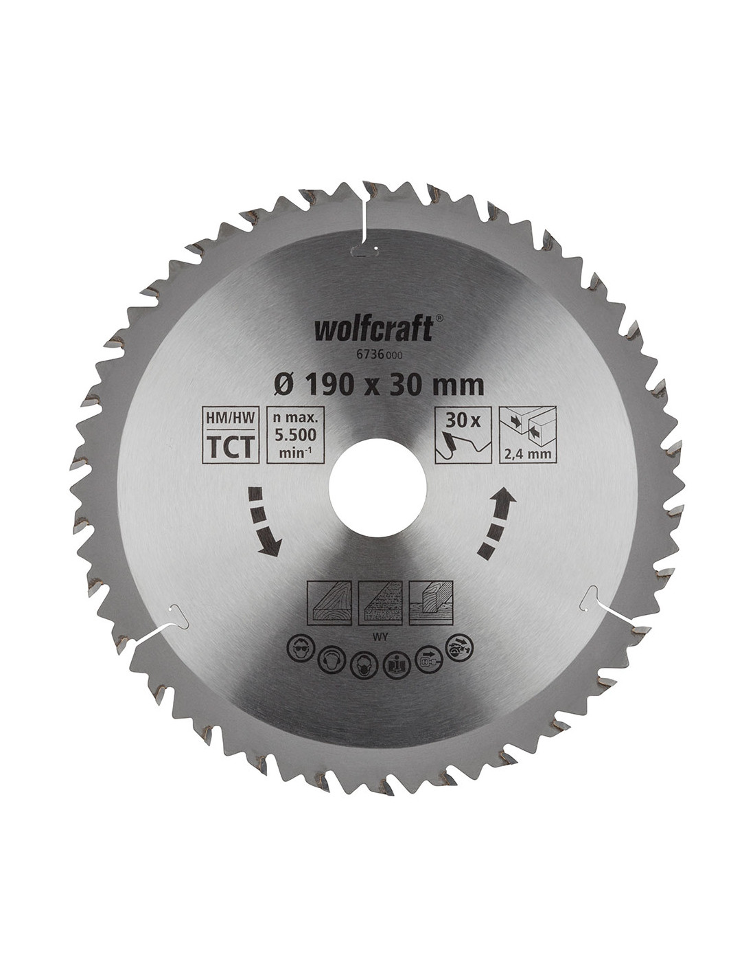 Lame de scie circulaire portative ct, série marron coupes rapides et grossières diamètre de travail: 190mm trou logement: 30mm largeur de coupe: 2,4mm nombre de cordons: 30 vitesse maximale rotation: 6000tr/min lame de scie ct avec dents alternées et faible nombre de dents pour des coupes longitudinales et transversales rapides et grossières dans le bois et les agglomérs longue durée dimensions: ø190mm poids: 0,385kg 6736000 wolfcraft