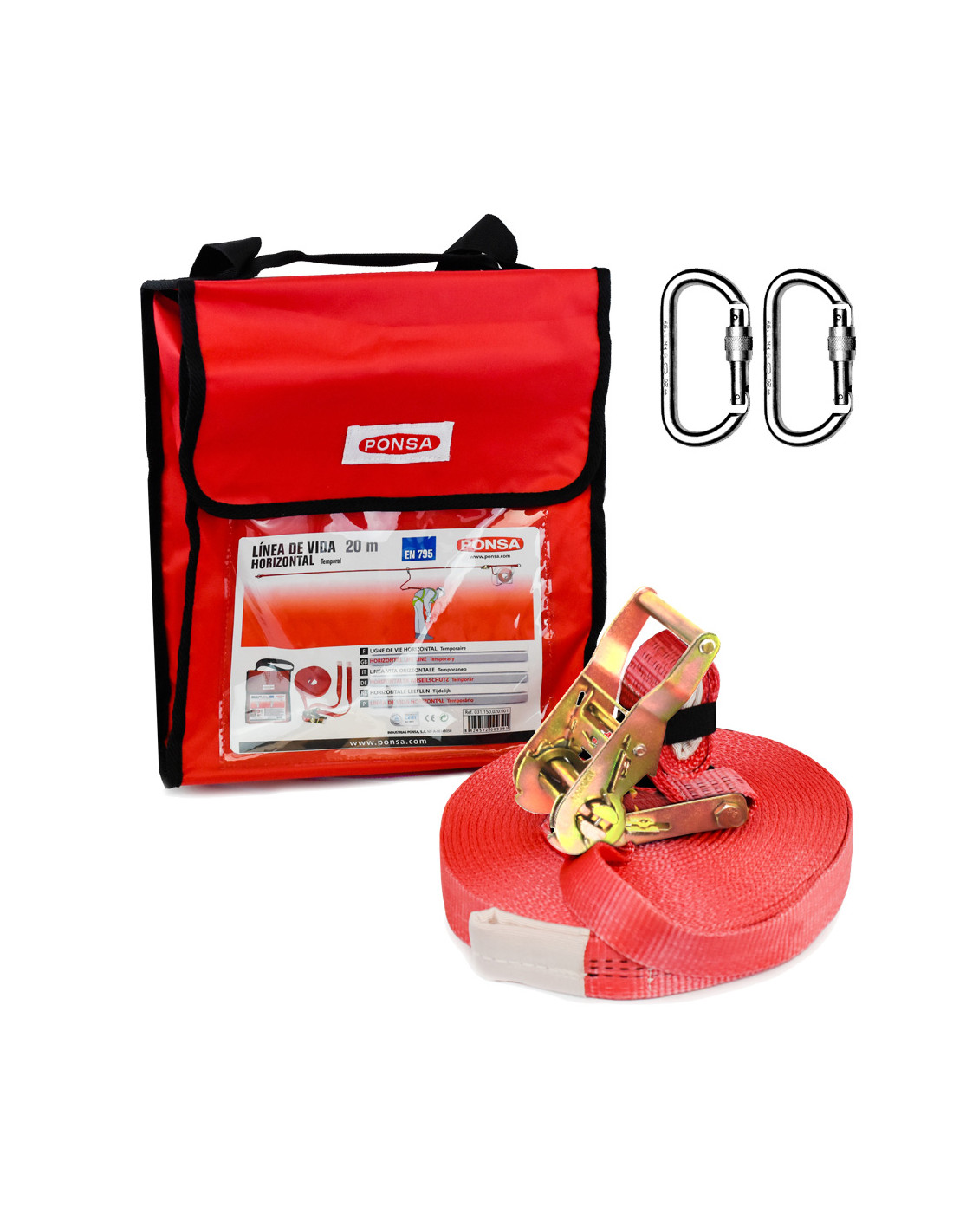 PONSALigne de vie horizontale 10 m 031,150,010,001 ponsa la ligne de vie horizontale a un système de tension qui permet de l'ajuster à la longueur nécessaire en plus de laisser l'excédent de ruban collecté dans le sac incorporé. facile à installer et léger. pour une utilisation avec deux opérateurs, nous recommandons un point d'ancrage entre eux. température d'utilisation : -40 ºc à 80 ºc. en 795:2012 type b cen-ts 16415:2013 matériaux : partie textile : 100 % polyester bande de 35 mm de large. pièces métalliques : tendeur : acier allié avec finition anticorrosion (galvanisé) crochet à mousqueton : aluminium aisi 14135, aisi 1215 finition anticorrosive (galvanisé)