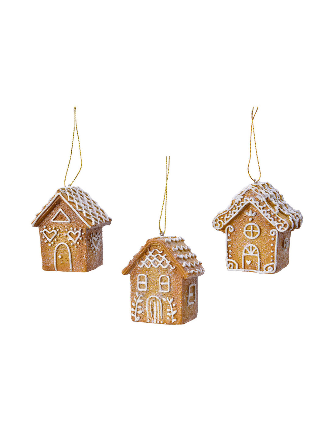 Maison polyresine (vente unité) modèles assortis. forme : pain d'épice, façon d'accrochage : cintre doré avec cintre