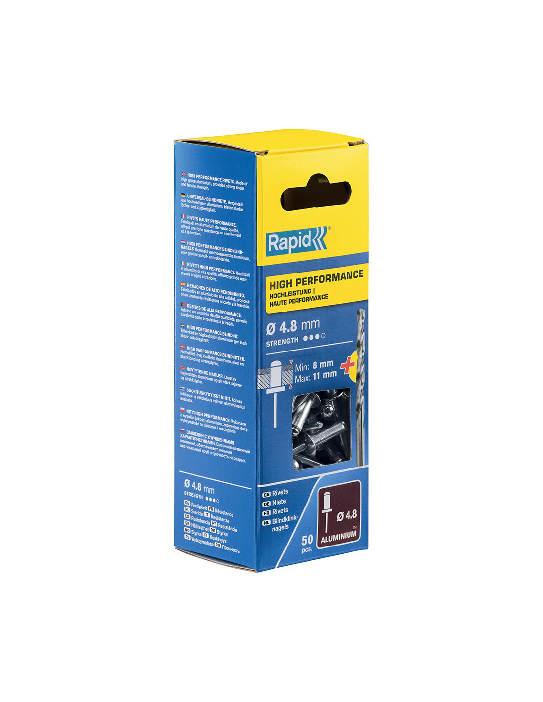 RapidBlister 50 rivets ø4,8x14mm. alu + embout 5000389 rapid. ces rivets en aluminium haute performance sont parfaits pour fixer des matériaux dans des endroits exposés tels que des garde-boue, des revêtements en métal et en plastique, des signes et des plaques métalliques. un foret de taille appropriée est inclus dans l'emballage.