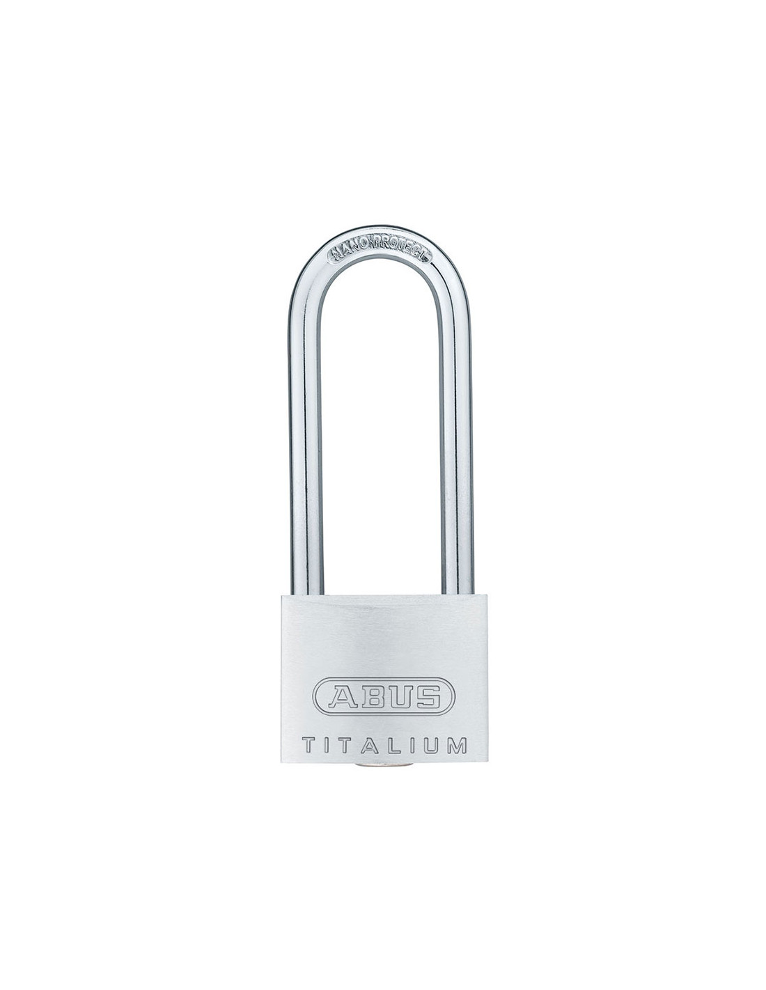 ABUSCadenas titalium tige extra longue 30mm corps de cadenas 64ti/30hb60 abus en alliage spécial d'aluminium titalium et tige en acier trempé avec traitement nano protect pour une grande résistance à la corrosion. profil de clé paracentrique pour accroître la protection contre la manipulation. rotor de cylindre chromé. tête de clé en forme de tulipa.