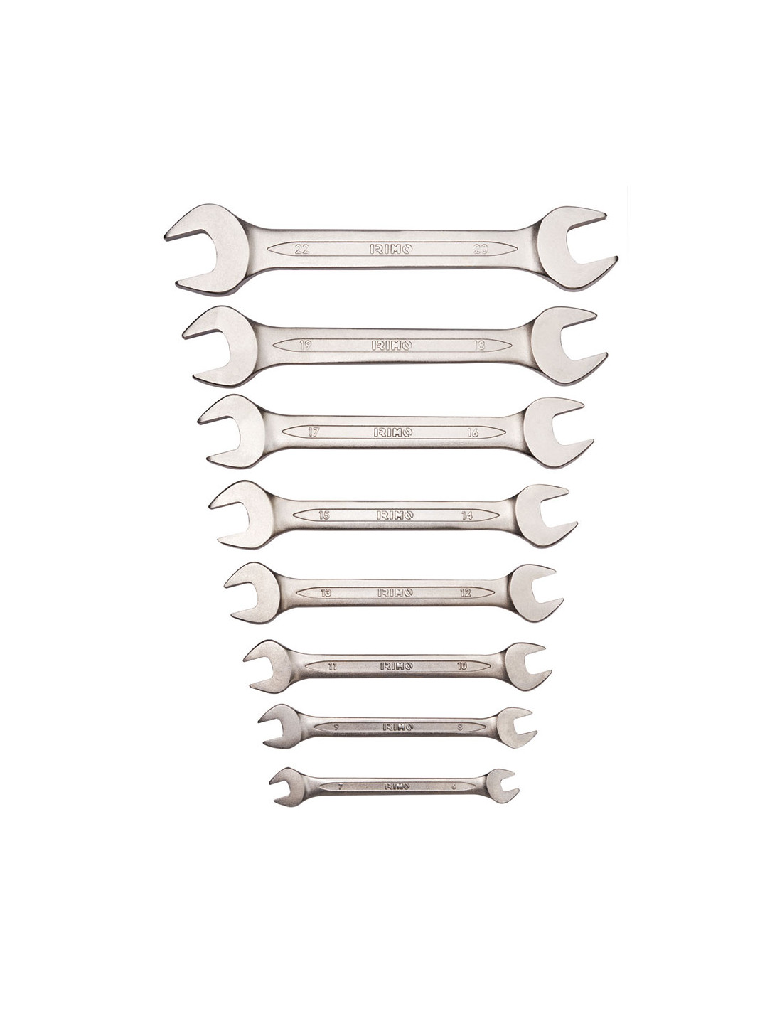 Jeu de 8 clés 6-22mm 10-8-h irimo. jeu de 8 pièces avec support en plastique. composants : clés de 6 × 7 à 20 × 22 mm. finition : chrome mat. matériau: acier allié haute performance. dureté : 42-50 hrc. normes : iso 10102.