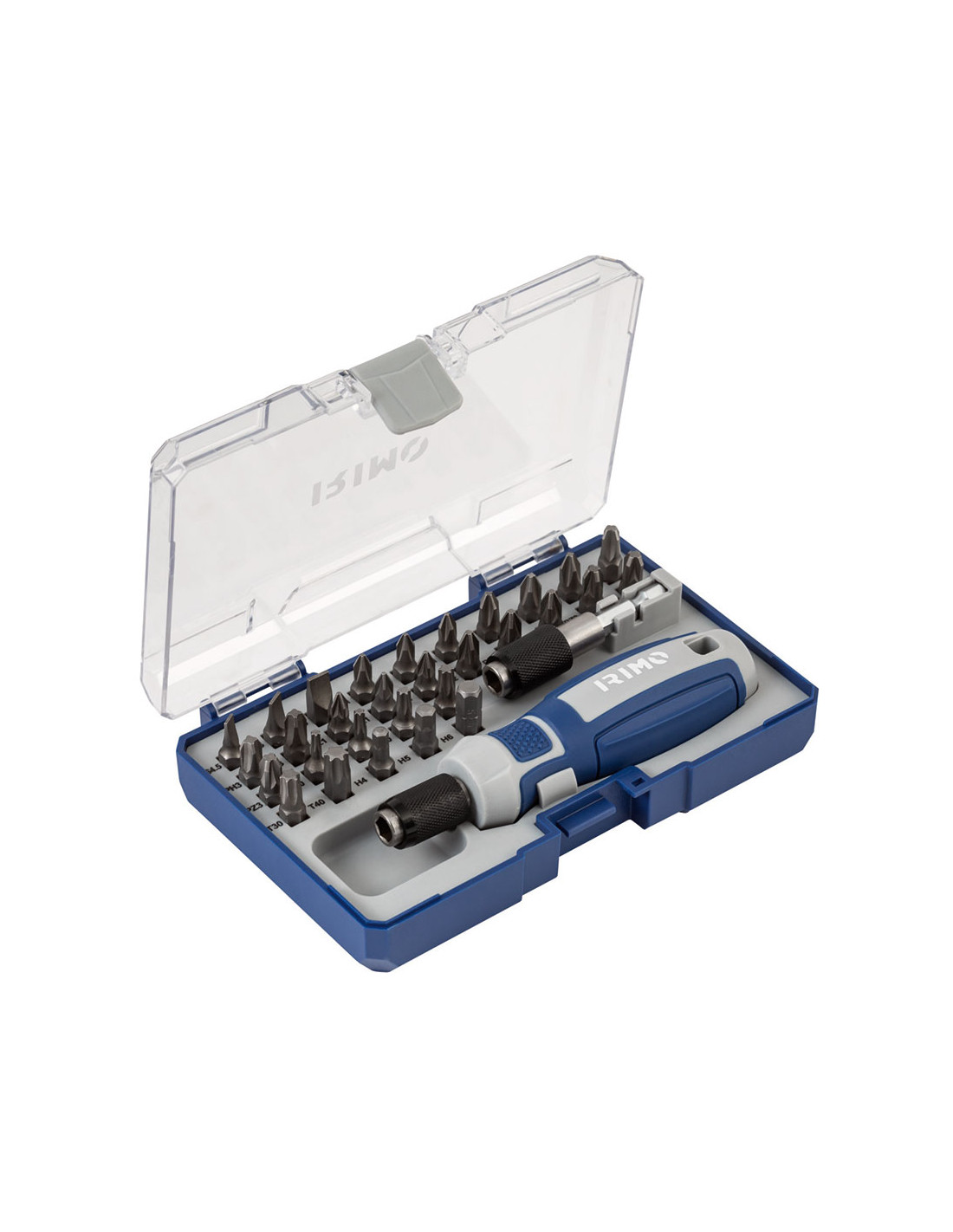 Jeu de 32 embouts 1/4" 475-32a-1 irimo. comprend un tournevis pour embouts interchangeables de ¼", 30 embouts et 1 porte-embout magnétique à dégagement rapide. le tournevis a un système de verrouillage magnétique pour un verrouillage simple et sûr vis fendues, phillips, pozidriv, torx® et hexagonales. entraînement carré hexagonal 1/4". 3 pz3 -torx : t10, t15, t20, t25, t30 et t40 -hexagonal : h4, h5 et h6 porte-embout magnétique avec dégagement rapide et système de verrouillage (style e 6.3) plastique résistant avec crochet, couvercle transparent, sous blister, din 3126, iso 1173, style c 6.3.