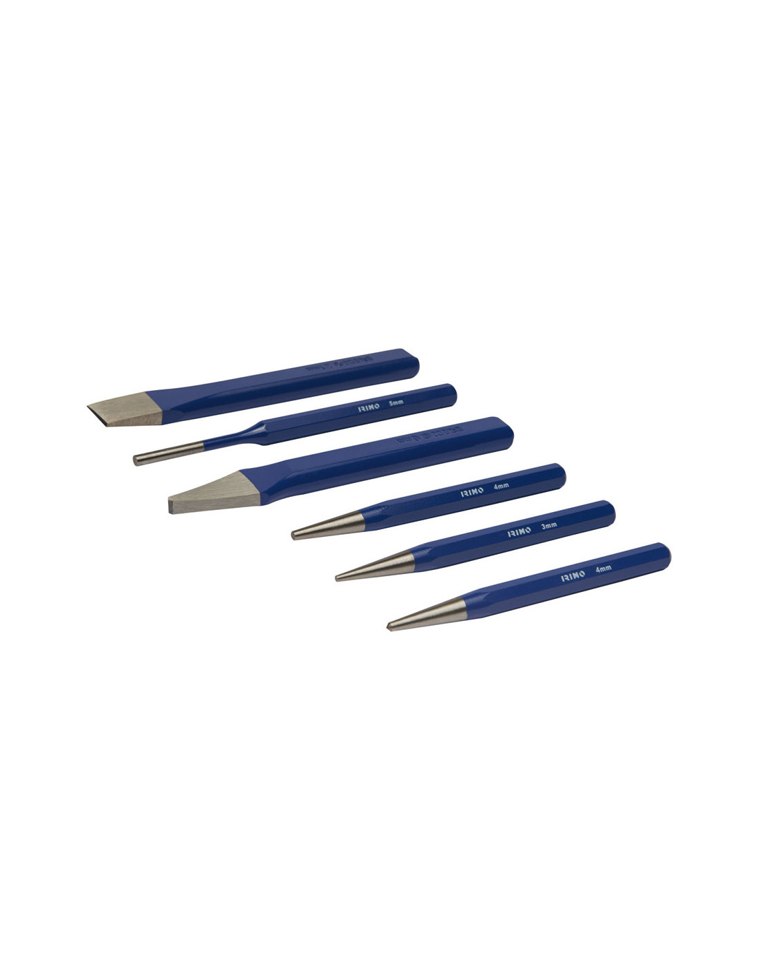 Jeu de 5 outils de frappe 519-93-4 irimo. l'ensemble comprend 6 pièces: - 150 mm burin plat sheetman. -tombe plate de 150 mm. -pointe 4 mm. -pins coniques : 3 et 4 mm. -pilote 5 mm. au cas où.