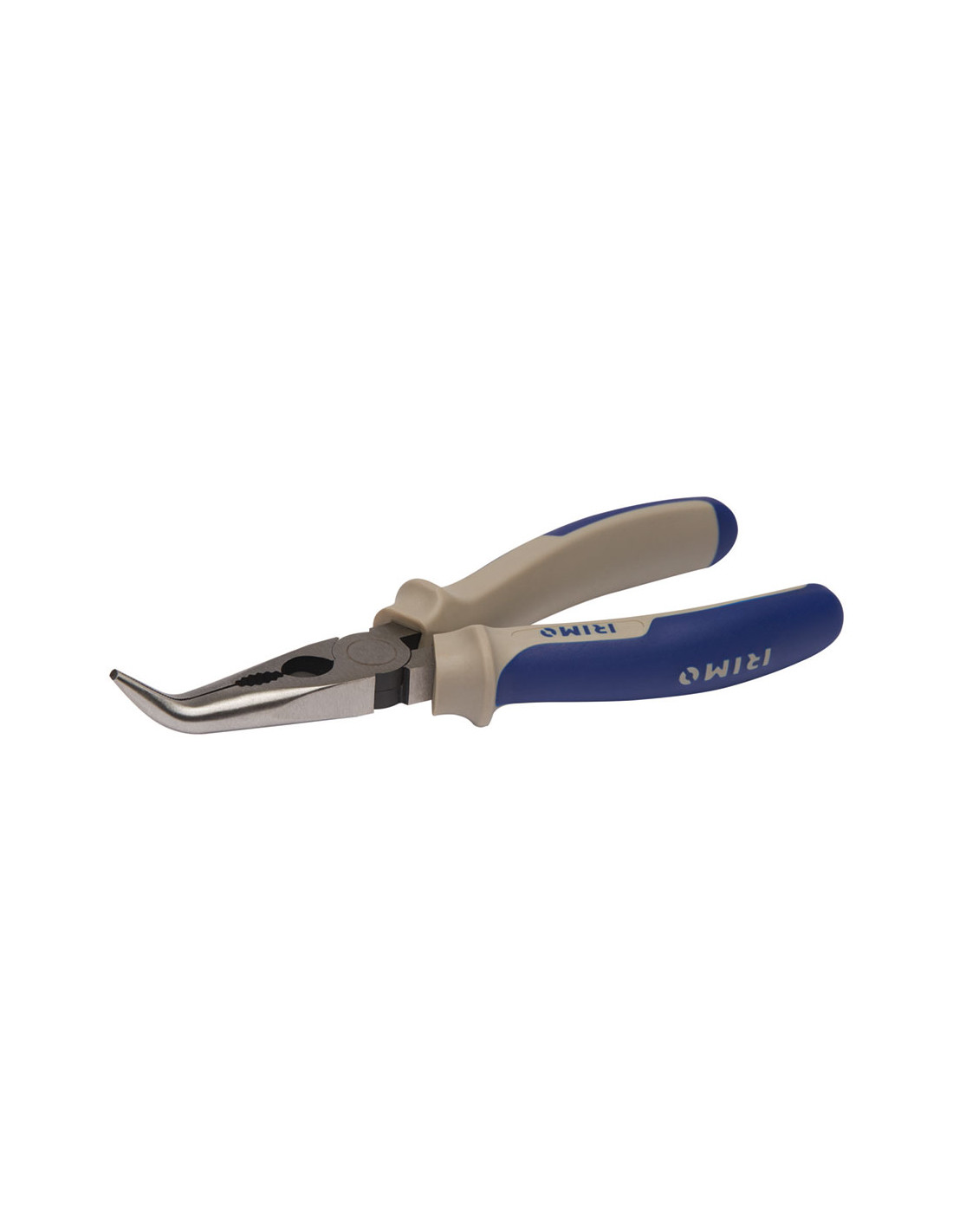 Pince à bec semi-rond courbe, 200mm 613-200-1 irimo. pince à bec demi-rond à bout courbé. avec pointe courbée à 45°. avec coupe trempée par induction pour câbles souple et dur. poignées : bi-matières et soft grip qui offrent confort et contrôle. finition poli. matériau: acier allié haute performance. dureté maximale du bord de coupe : 58-65 hrc. norme : iso 5745. capacité de coupe max : 1- fil de cuivre, 2- fil de dureté moyenne.