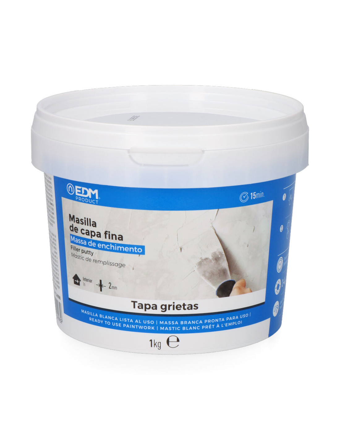 Mastic couche fine prêt à l'emploi 1kg edm. couvre les fissures pour des réparations rapides. pâte à séchage rapide pour la réparation de petites fissures, fissures et trous de clous sur les murs et les plafonds. appliquer sur des supports propres et sains. poncer et peindre après séchage complet. contient bit, cmit/mit comme agents de conservation. peut déclencher une réaction allergique. temps de travail: illimité. il peut être travaillé (ponçé, peint) presque immédiatement, en 10-15 min. temps de sechage: 2-4h/mm. performances: 1,70kg/m²/mm.