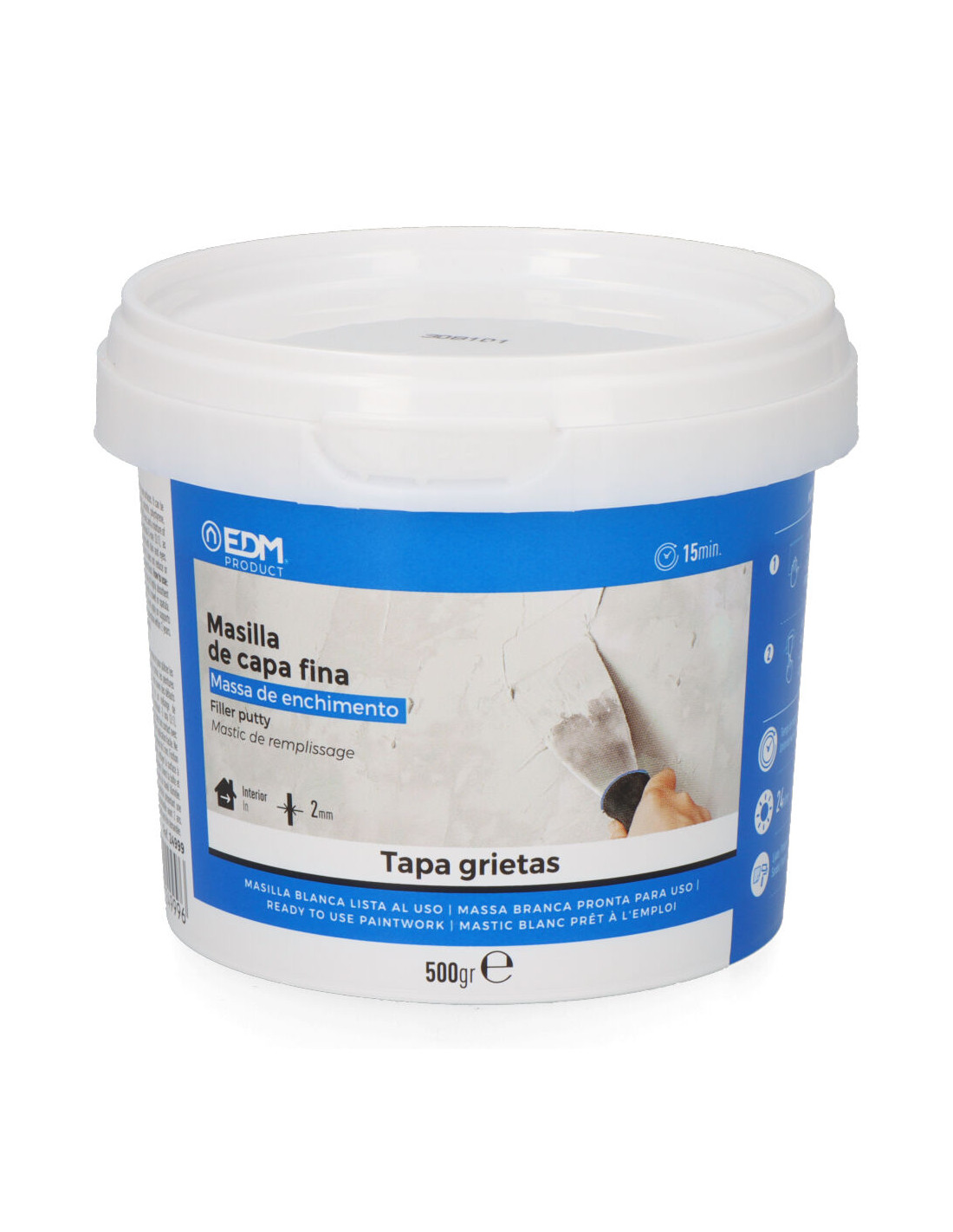 mastic couche fine prêt à l'emploi 500g edm. couvre les fissures pour des réparations rapides. pâte à séchage rapide pour la réparation de petites fissures, fissures et trous de clous sur les murs et les plafonds. appliquer sur des supports propres et sains. poncer et peindre après séchage complet. contient bit, cmit/mit comme agents de conservation. peut déclencher une réaction allergique. temps de travail: illimité. il peut être travaillé (ponçé, peint) presque immédiatement, en 10-15 min. temps de sechage: 2-4h/mm. performances: 1,70kg/m²/mm.