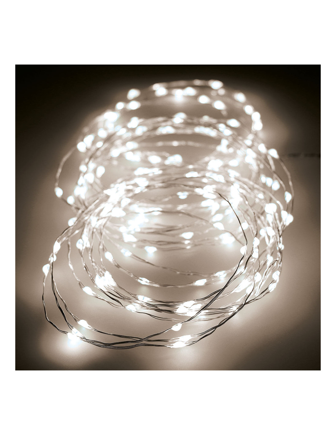 LUMINEOGuirlande micro led scintillante 180 led lumière chaude. 8 fonctions de lumière et effet mémoire. câble argenté. ip44 transformateur. câble d'alimentation: 5m. distance entre la première ampoule et la dernière: 9m. longueur totale: 14m distance entre ampoules 5cm. ampoules non remplaçables.