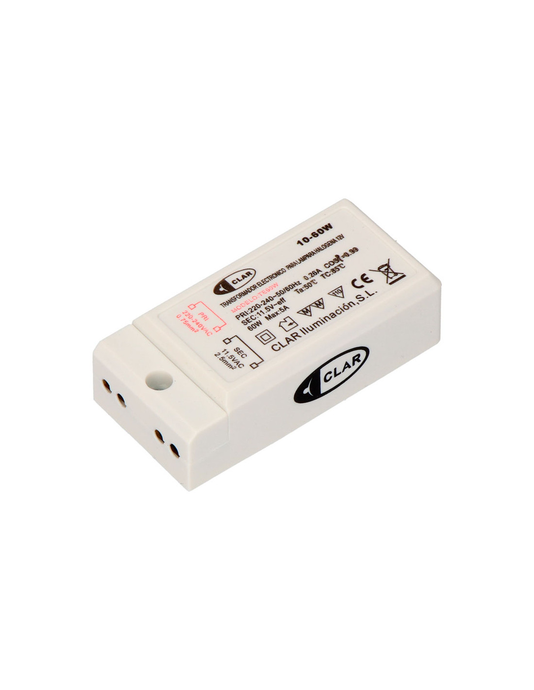 Transformateur électronique pour lampe halogène 12v 10/60w mesures: 67x33x20mm (largeur/profondeur/hauteur). courant alternatif
