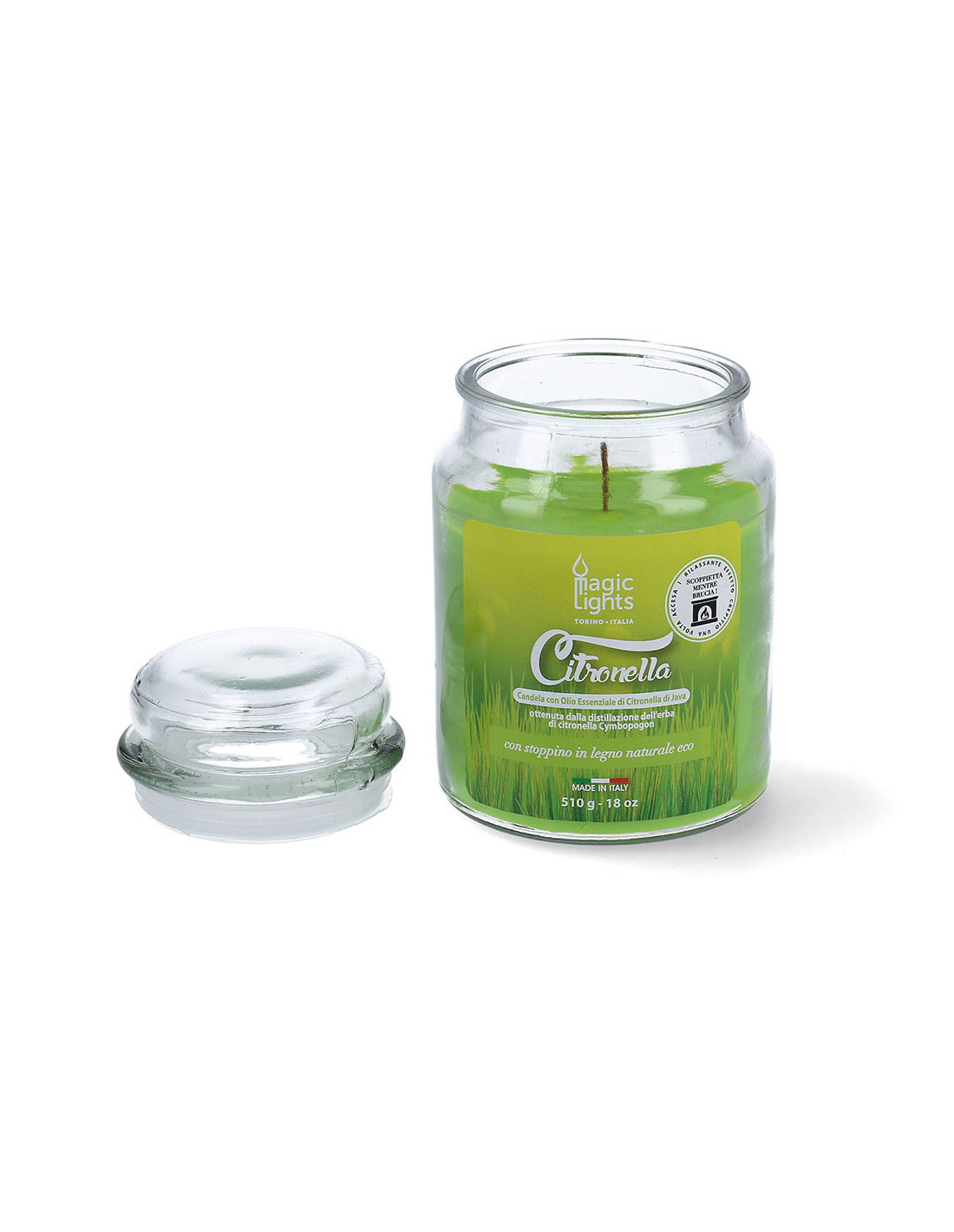Bougie citronnelle en pot 510ml magic lights. cire pressée non coulée avec une durée plus longue.