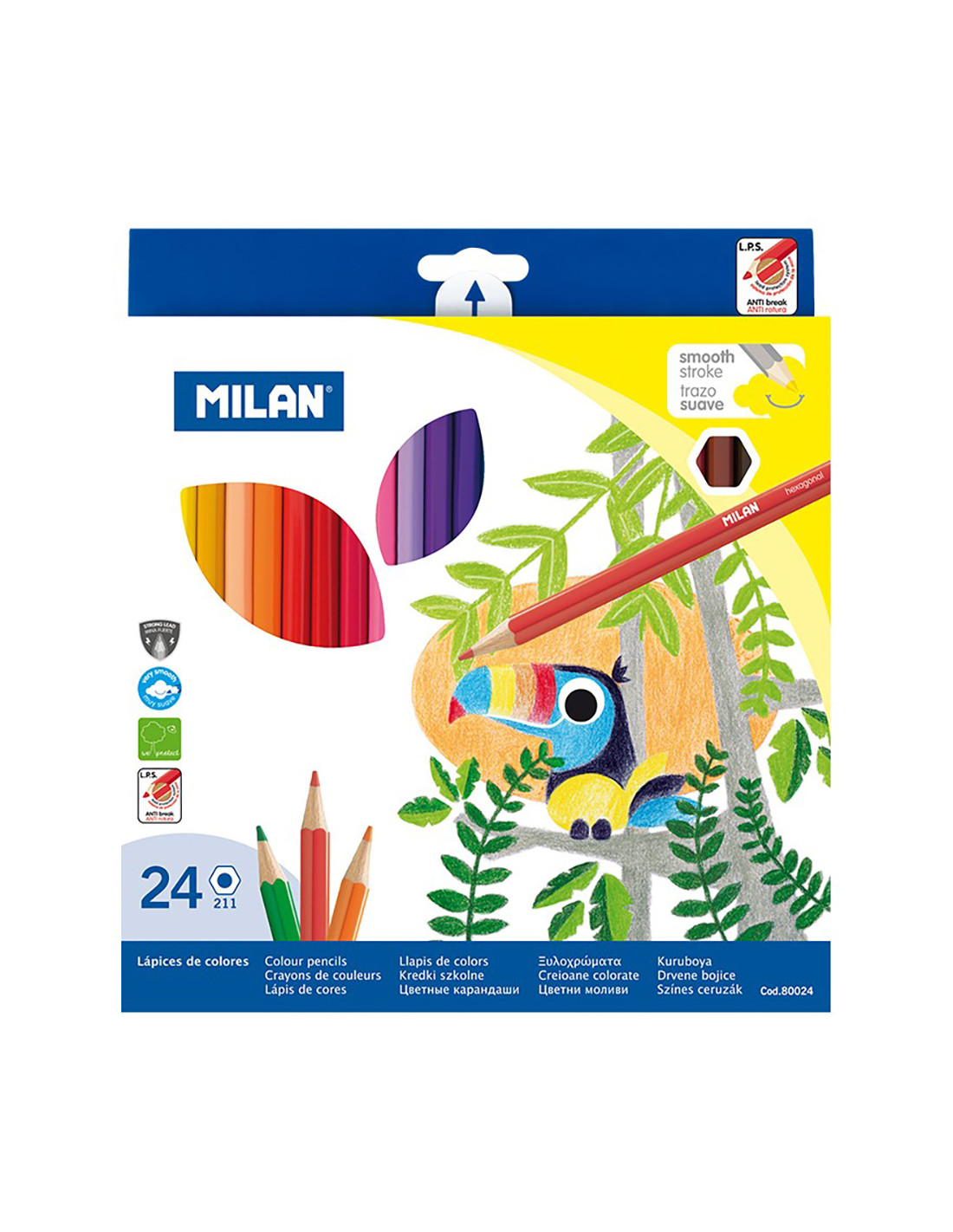Pack 24 crayons de couleur milan. crayons de couleur hexagonaux. mine de ø2.9mm. la mine permet un tracé uniforme et resistant à la casse grace a son systeme lps (lead protection system) qui protege la mine grace a son adherence au bois. bois provenant de plantations durables. 24 couleurs. chaque couleur a un nom propre. inclut base interieure.