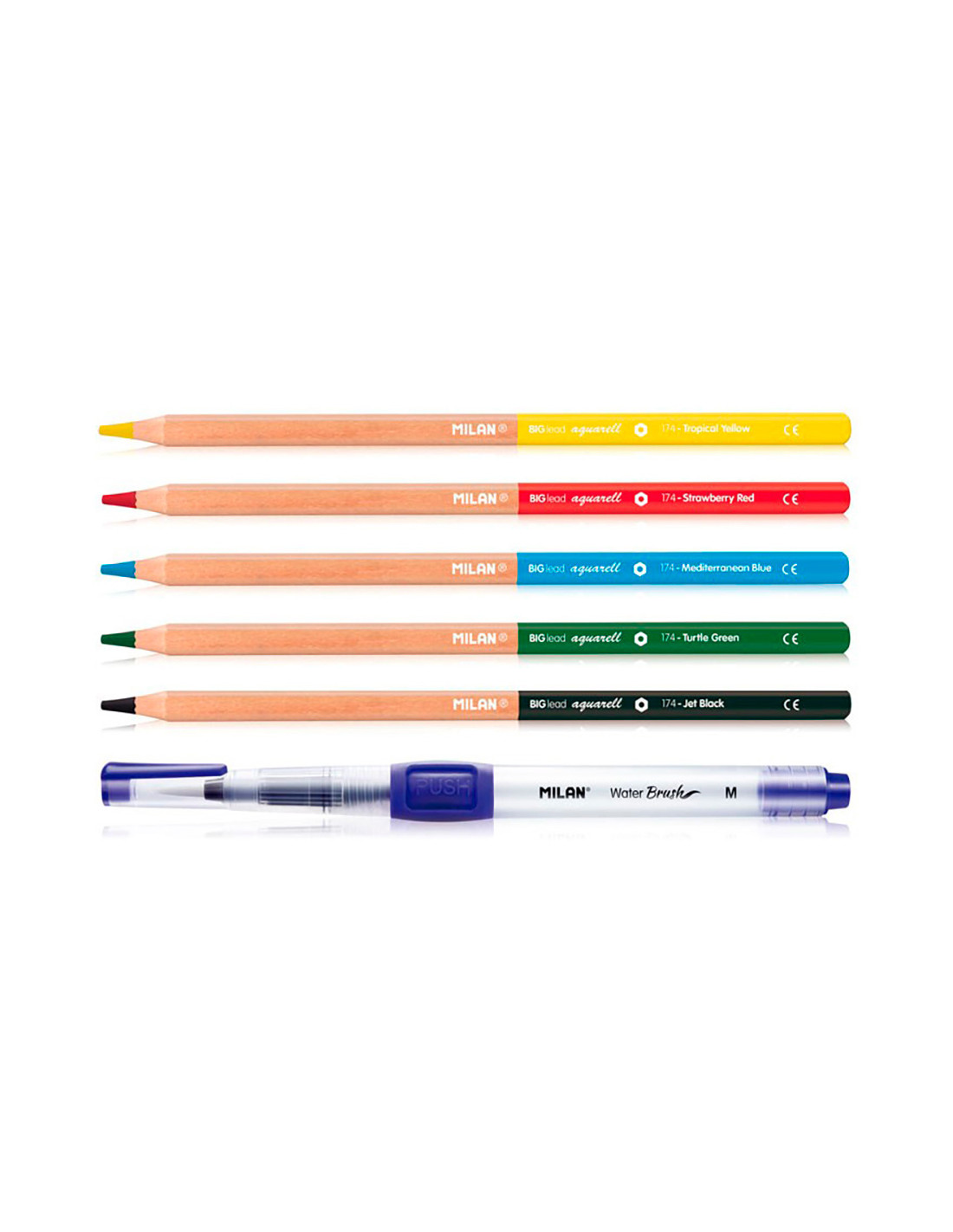 Blister pinceau rechargeable water brush + 5 crayons aquarelle milan. pinceau avec reservoir d'eau rechargeable de 8ml. adapté pour peindre avec crayons aquarellables, pastilles d'aquarelle, teintes ou techniques qui requierent de l'eau. pinceau synthetique rond de ø4mm avec bouchon hermetique. bouton poussoir permettant de reguler la quantite de liquide. 5 crayons de couleurs aquarellables avec mine epaisse de ø3,5mm