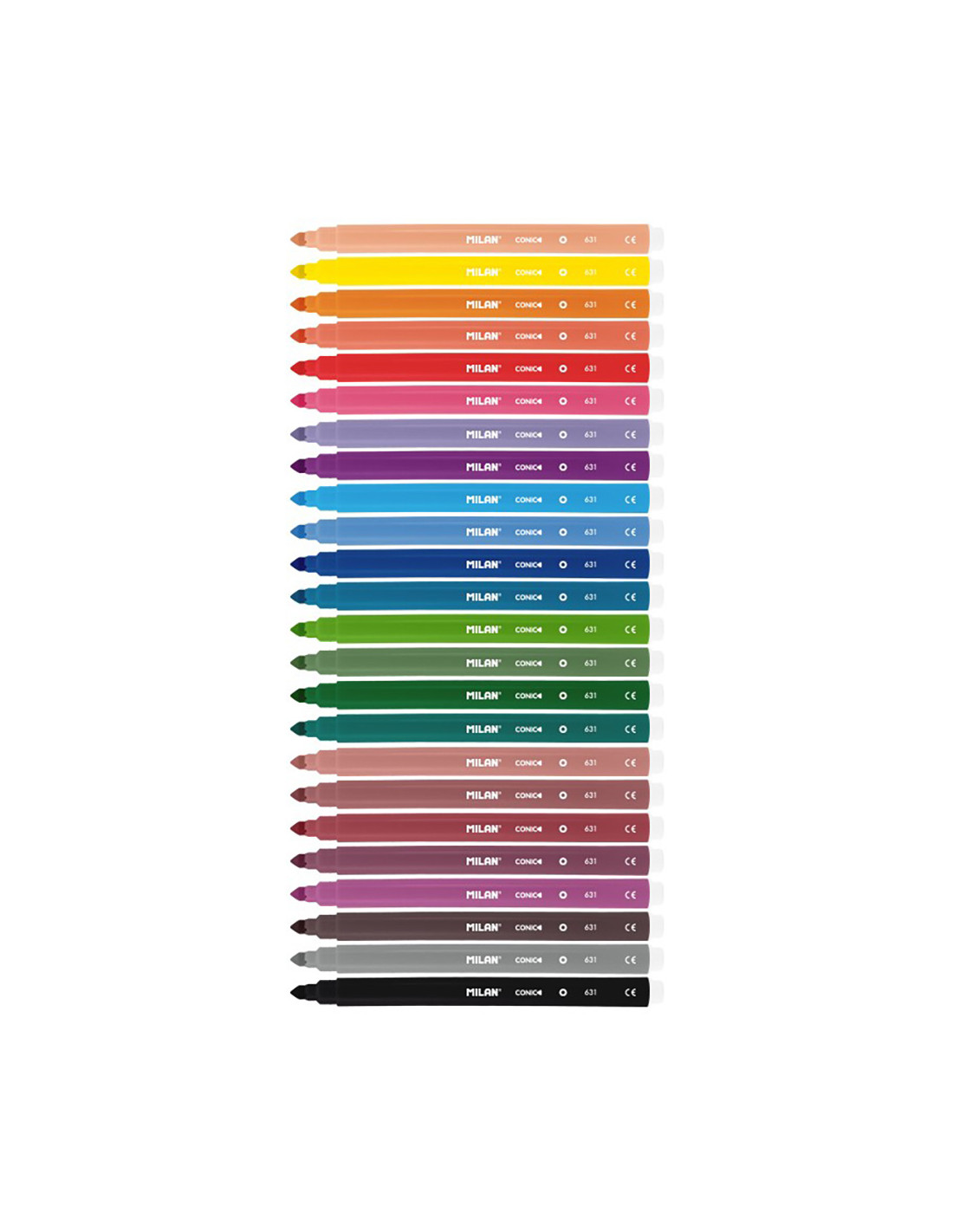 Boite 24 feutres pointe conique base aqueuse milan. feutres à pointe conique ø5mm qui permet de realiser des tracés de 0.75mm a 3mm. pointe resistante aux coups et a la pression. encre a base d'eau qui donne des couleurs brillantes de facile application, melangeables entre elles. du fait de son type de mine il sont recommandes pour remplir des surfaces de couleur. lavage facile sur la plupart des tissus (mettre le vetement à tremper dans de l'eau froide pendant une heure puis laver en machine à froid). capuchon de securité ventilé. 24 couleurs.