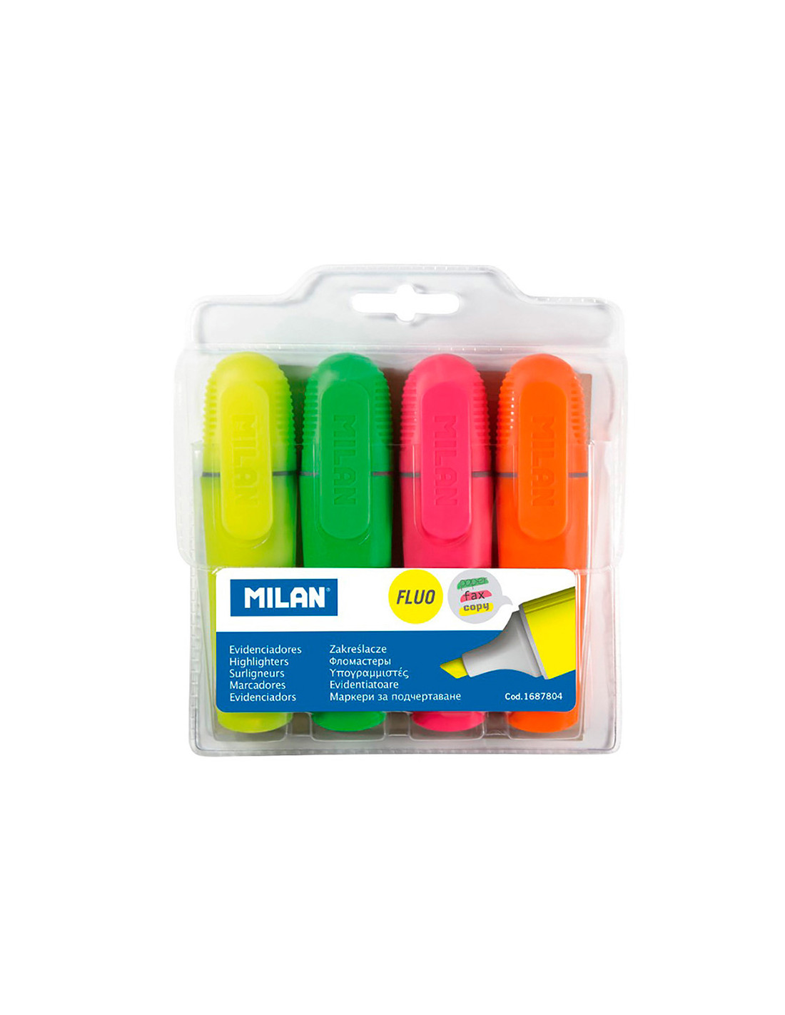 Pack de 4 fluorescents marqueurs pointe biselée milan. 4 feutres fluorescents couleur jaune, orange, rose et vert. mine biselée 1 - 4,8mm pour souligner et faire ressortir un elementr sur papier, photocopies ou papier thermique.
