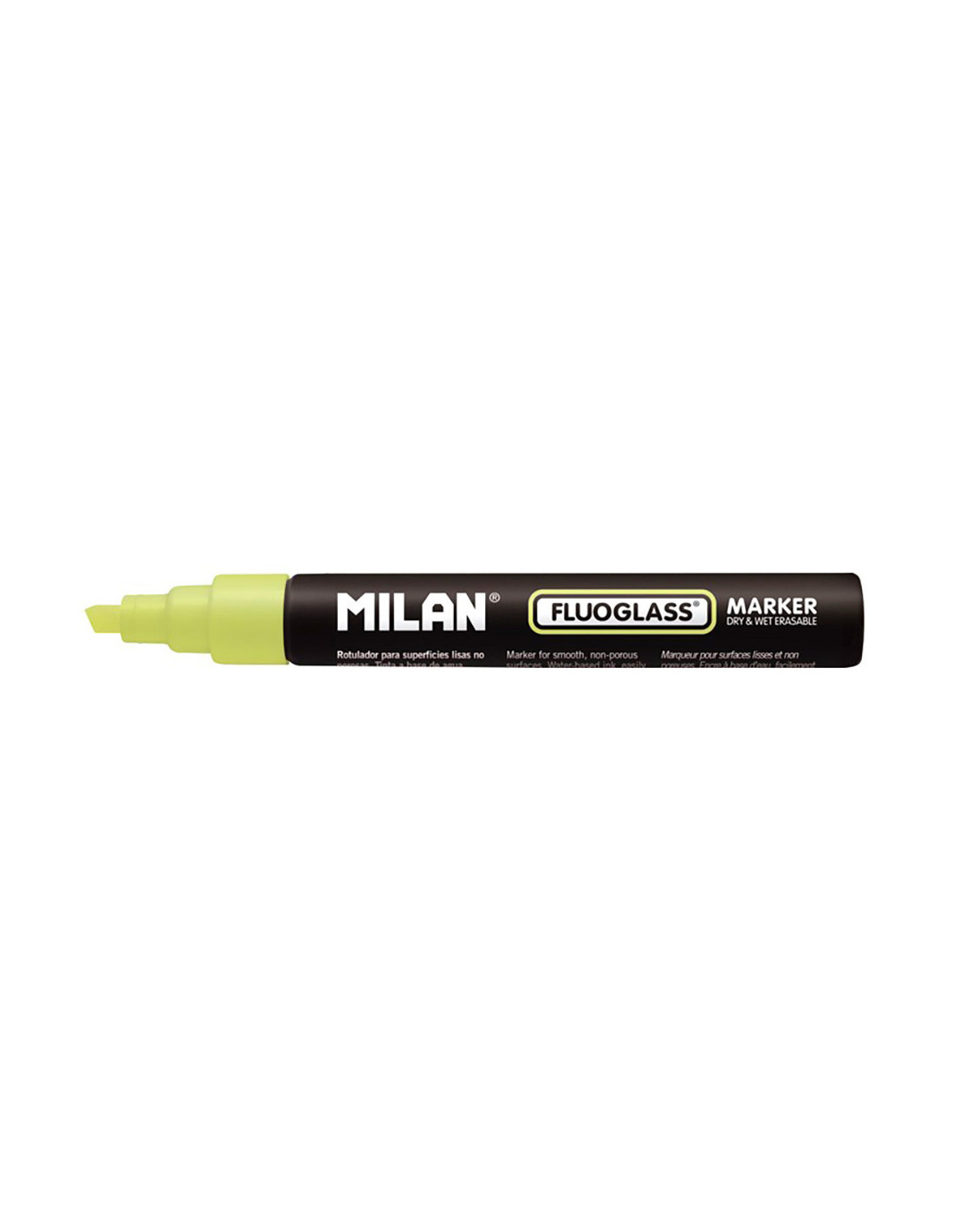 Blister feutre jaune fluoglass 2 - 4mm milan. feutres pour surfaces lisses non poreuses (fenetres, miroirs, tableaux, etc.). pointe biselée 2 - 4mm. encre à base d'eau, facilement effaçable avec l'aide d'un chiffon humide. grace a sa haute concentration en pigments, les couleurs se maintiennent intenses et brillantes, couleur jaune.