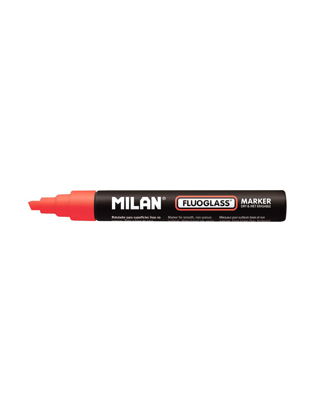 Blister feutre rouge fluoglass 2 - 4mm milan. feutres pour surfaces lisses non poreuses (fenetres, miroirs, tableaux, etc.). pointe biselée 2 - 4mm. encre à base d'eau, facilement effaçable avec l'aide d'un chiffon humide. grace a sa haute concentration en pigments, les couleurs se maintiennent intenses et brillantes, couleur rouge.