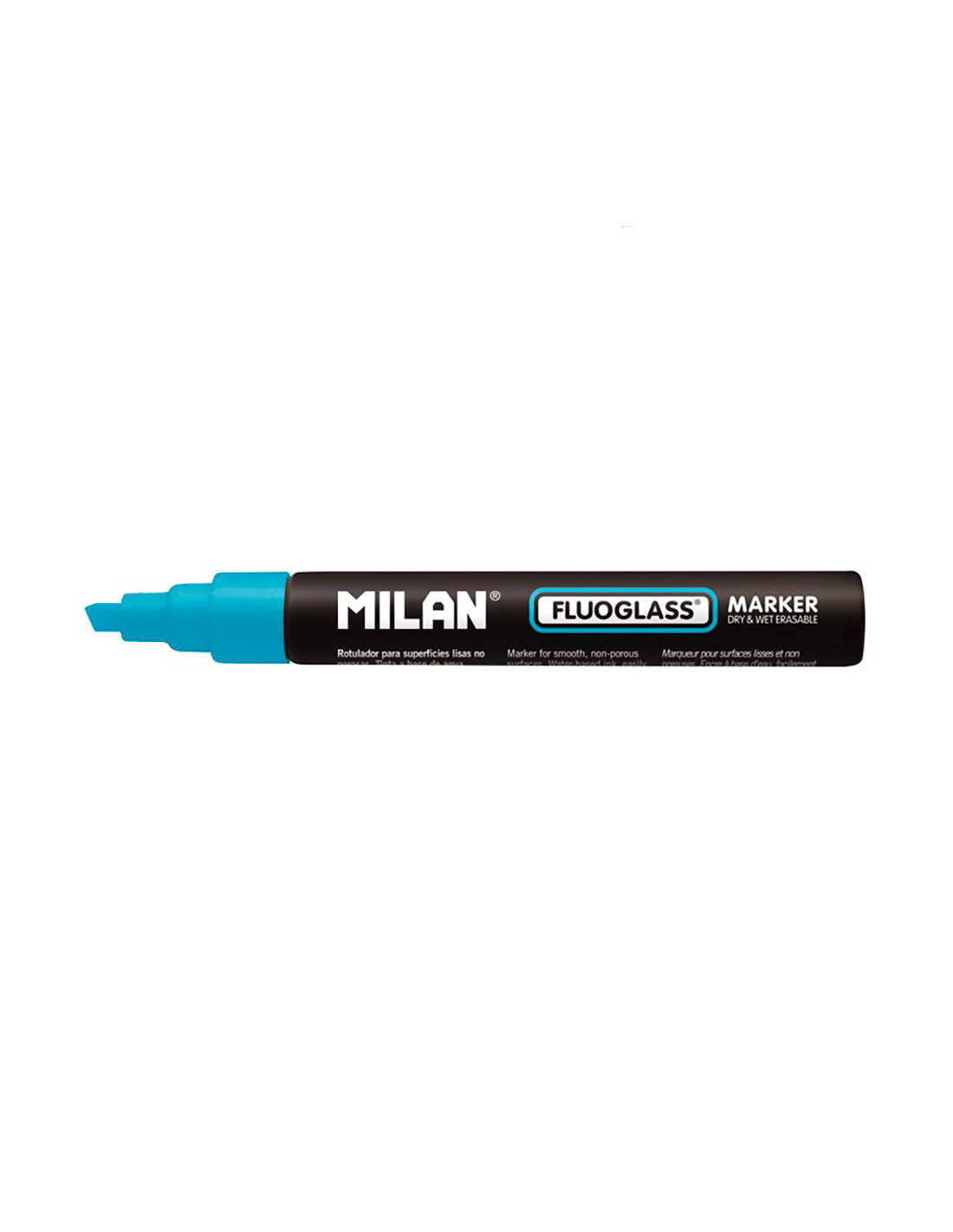 Blister feutre bleu fluoglass 2 - 4mm milan. feutres pour surfaces lisses non poreuses (fenetres, miroirs, tableaux, etc.). pointe biselée 2 - 4mm. encre à base d'eau, facilement effaçable avec l'aide d'un chiffon humide. grace a sa haute concentration en pigments, les couleurs se maintiennent intenses et brillantes, couleur bleue.
