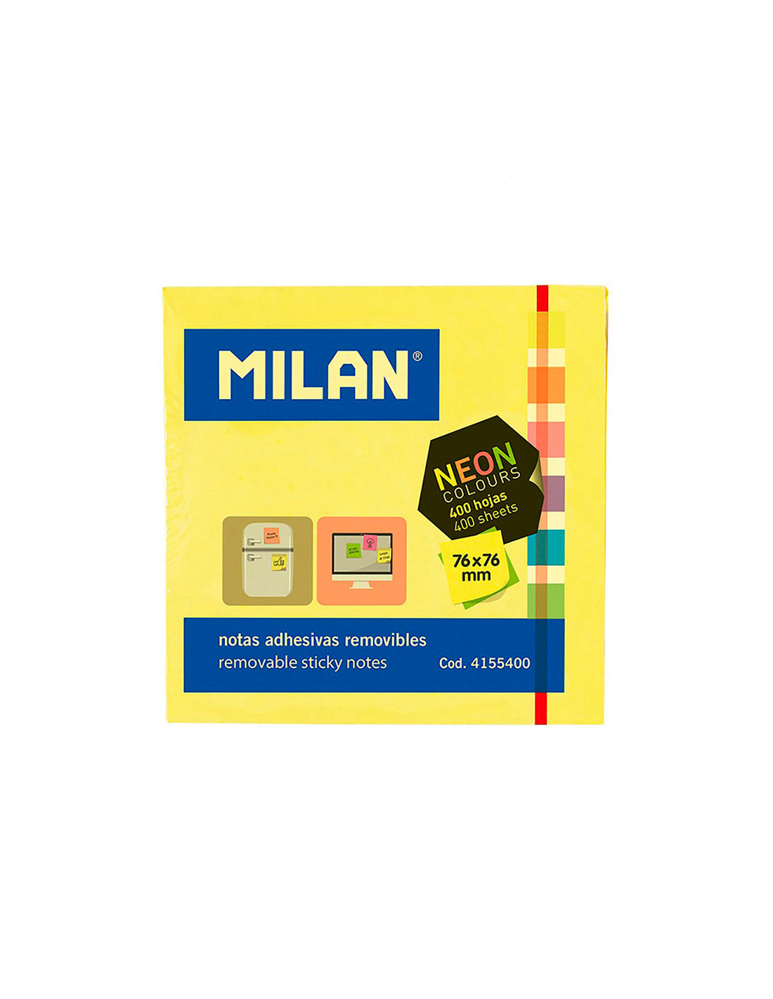 Pack 400 notes adhesives 76x76mm fluor milan colors. notes adhésives amovibles en 6 couleurs néon, intérieures avec des feuilles blanches. couleurs: jaune, orange, rose, lilas, bleu, vert et blanc. 76 x 76 mm.