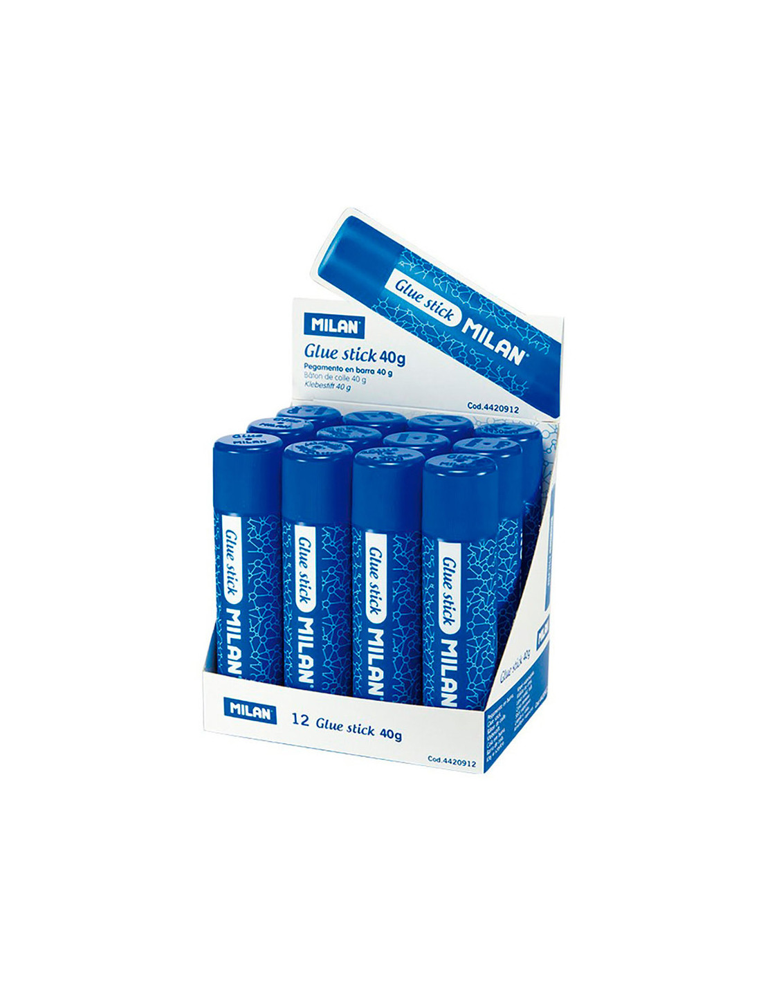 Colle en barre 40g milan prix par unité. colle à barres grand format, 40g. polyvalent: colle facilement papier, carton, photos, tissu, feutre, liège, cuir et mousse. sans solvant, idéal pour l'usage scolaire. mesures: ø3x12cm de longueur