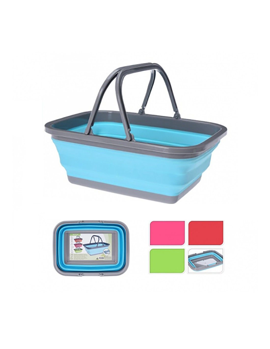 Panier avec anses pliables couleurs variées 39x27x28cm poids 550 grammes, plié 39x27x6,5cm, déplié sans anses 339x27x14,5cm. matériau pp gris 4 couleurs variées: vert, bleu, rouge, rose.