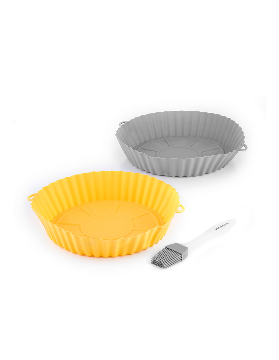 Paniers en silicone avec pinceau pour friteuses à air v0103786 innovagoods ensemble de 2 paniers en silicone pour friteuses paniers en silicone antiadhésifs et flexibles, mesures approximatives de 24,5x4,5x21,5cm. idéaux pour les friteuses sans huile, le four et le micro-ondes. inclut un séparateur, des poignées et sont réutilisables. facilitent la cuisson et le nettoyage.